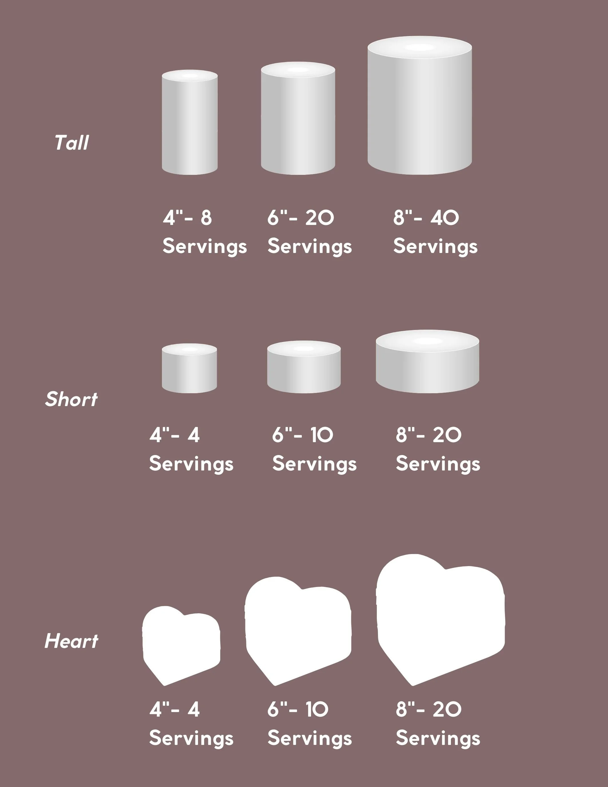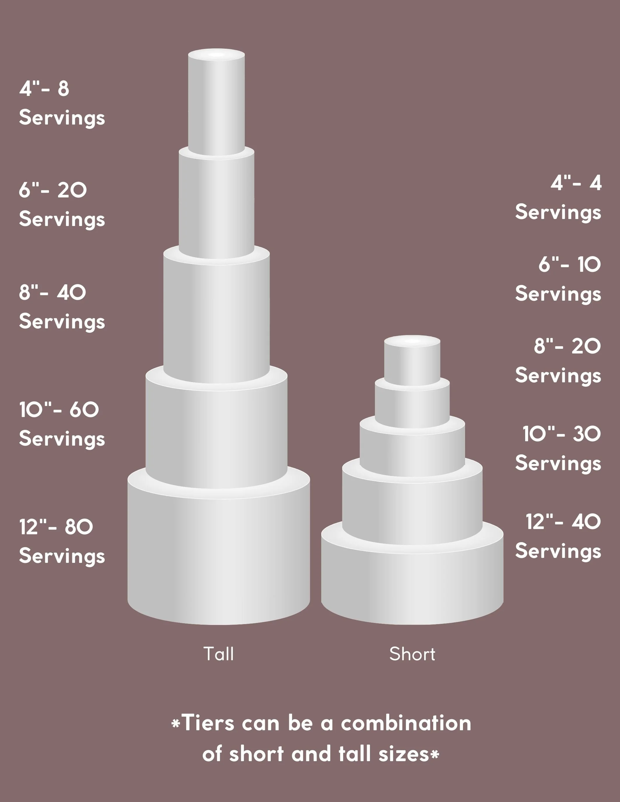 For single tier cakes. Pricing is base pricing only and subject to change based on design or flavors. Sizing listed is based on diameter in inches. Tall tiers are twice the height as short tiers. Larger sizes available upon request.